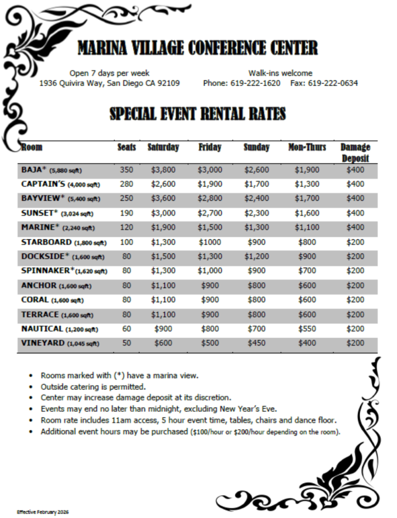 Conference Center – 619.222.1620   |      Marina – 619.224.3125   |      619.222.0634   |   1936 Quivira Way, San Diego, CA, 92109   |   Open 7 days per week!